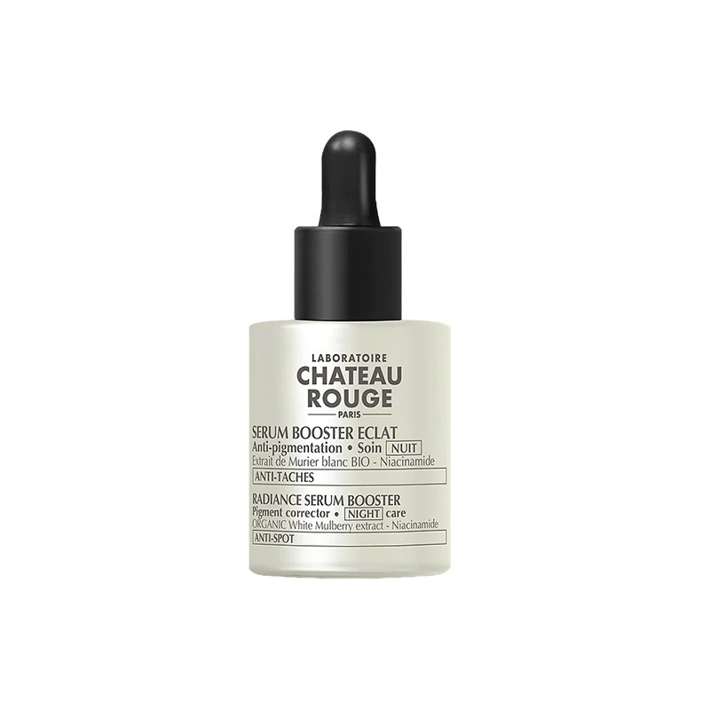 Ce sérum booster ultra-concentré est un soin nuit qui cible l’hyperpigmentation, les irrégularités et les taches. Il stimule aussi la luminosité globale et unifie le teint. La peau perd immédiatement son aspect terne et retrouve toute sa lumière. Elle semble plus translucide et lumineuse. Sa haute concentration en actifs éclaircissants (Extrait de Murier blanc BIO + Niacinamide) contribue à réduire l’hyperpigmentation.