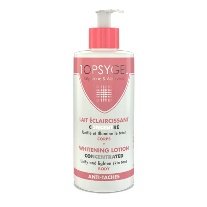 Le lait corps éclaircissant TOPSYGEL nourrit la peau abîmée grâce aux valeurs nutritives de la glycérine et l'Aloe Vera.