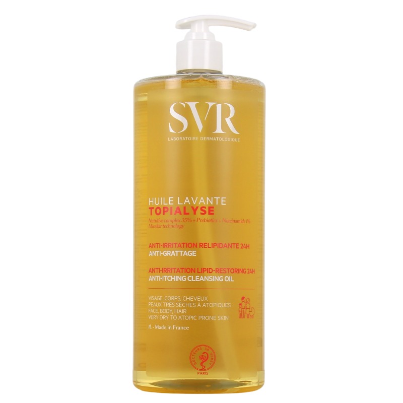 L'huile lavante Topialyse a été développée par le Laboratoire SVR pour s'adapter à tous les types de peaux. Cette huile lavante remplace tous les autres soins nettoyants puisqu'elle s'utilise aussi bien en gel douche qu'en shampooing, en démaquillant, en bain moussant, en produit d'hygiène intime ou encore en tant que nettoyant pour les mains et le visage.
