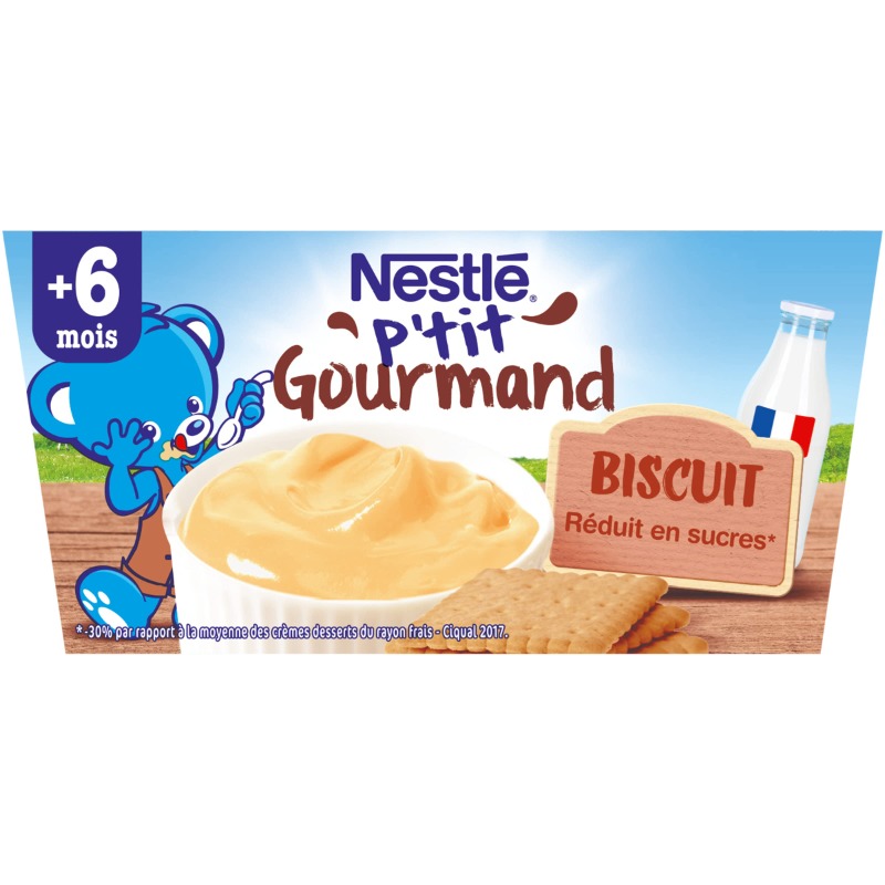 NESTLE P'TIT GOURMAND Biscuit, le laitage qui a du bon conçu exprès pour bébé, réduit en sucres. Élaboré avec des ingrédients de qualité, ce laitage gourmand au bon goût biscuit ravira ses papilles dès l'âge de 6 mois. Une recette produite dans les Vosges avec du lait local. Pratique pour les parents, ce laitage destiné à bébé vous accompagne partout. Il peut être conservé à température ambiante jusqu'à son ouverture. Conformément à la réglementation sur les aliments pour bébés. -45% de sucres par rapport à la moyenne des crèmes desserts du rayon frais - Ciqual 2020. Une majorité de notre lait provient de coopératives situées à moins de 200km de notre lieu de fabrication. Biscuit origine UE.