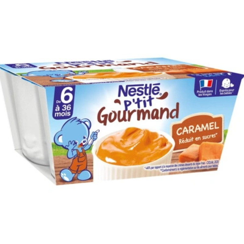 NESTLE P'TIT GOURMAND Caramel, le laitage qui a du bon conçu exprès pour bébé, réduit en sucres. Élaboré avec des ingrédients de qualité, ce laitage gourmand au bon goût de caramel pour bébé ravira ses papilles dès l'âge de 6 mois. Une recette produite dans les Vosges avec du bon lait français. Pratique, il s'emporte partout grâce à notre procédé de fabrication spécifique qui permet une conservation hors du frigo. Conformément à la réglementation sur les aliments pour bébés. -44% de sucres par rapport à la moyenne des crèmes desserts du rayon frais - Ciqual 2020.