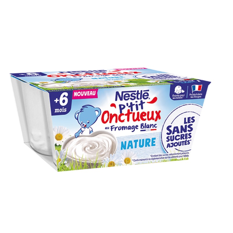 NESTLE P'TIT ONCTUEUX Nature au fromage Blanc. Le laitage onctueux sans sucres ajoutés conçu spécialement pour bébé et produit dans les Vosges ! Pratique, il s'emporte partout grâce à notre procédé de fabrication spécifique qui permet une conservation hors du frigo. Contient des sucres naturellement présents. Conformément à la réglementation sur les aliments pour bébés.