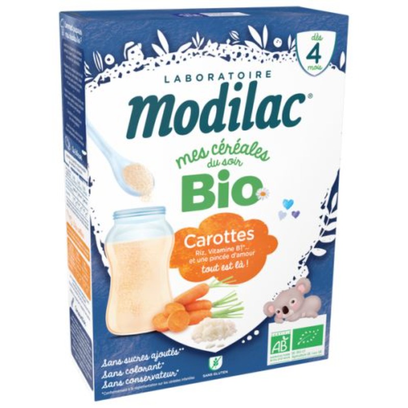 Les Céréales Bio Carottes Modilac sont fabriquées avec des ingrédients issus de l’agriculture biologique, contenant des sucres naturellement présents, pour une diversification alimentaire en douceur de bébé. Chez Modilac, nous avons à cœur de préserver le bon goût des céréales en élaborant des recettes sans sucres ajoutés (contient des sucres naturellement présents) et sans ingrédients superflus. Nous pensons que bien nourrir bébé dès son plus jeune âge est essentiel. C’est pourquoi afin de rester fidèle au goût de la nature et préserver les bienfaits des céréales nous avons travaillé avec le moins d’ingrédients possibles. Et parce que prendre soin des bébés c’est également préserver l’environnement dans lequel ils vont grandir et s’épanouir nous avons sélectionné des ingrédients issus de l’agriculture biologique.
