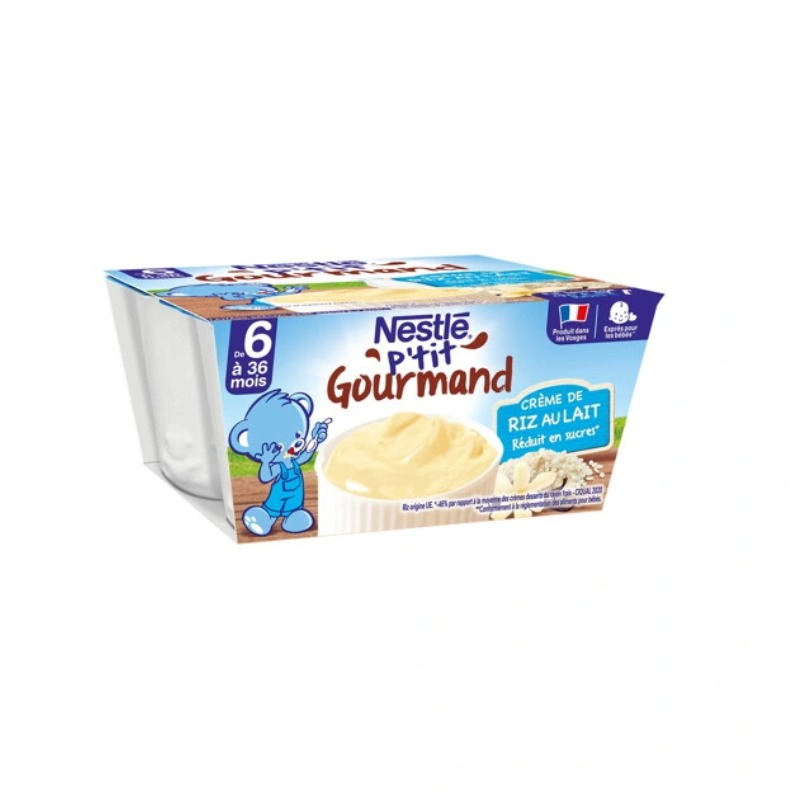 NESTLE P'TIT GOURMAND Crème de riz au lait, la crème dessert à teneur réduite en sucres, conçue exprès pour bébé. Une recette produite dans les Vosges avec du lait français local, et une texture onctueuse. Élaboré avec des ingrédients de qualité, ce laitage gourmand et crémeux pour bébé ravira ses papilles dès l'âge de 6 mois. Pratique pour les parents, ce laitage destiné à bébé vous accompagne partout. Il peut être conservé à température ambiante jusqu'à son ouverture. Par rapport à la moyenne des crèmes desserts du rayon frais - Ciqual 2020. Conformément à la réglementation sur les aliments pour bébés. Une majorité de notre lait provient de coopératives situées à moins de 200km de notre lieu de fabrication. Riz origine UE.