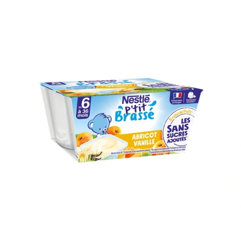P'TIT BRASSE Abricot Vanille Sans Sucres Ajoutés avec 5 fois plus de fruits. Un laitage conçu exprès pour bébé et produit à Arches dans les Vosges avec du lait français. Pratique, il s'emporte partout grâce à notre procédé de fabrication spécifique qui permet une conservation hors du frigo. Contient des sucres naturellement présents. Par rapport à la moyenne des P'TIT BRASSE aux fruits sucrés Conformément à la réglementation des aliments pour bébés. Abricot origine UE.