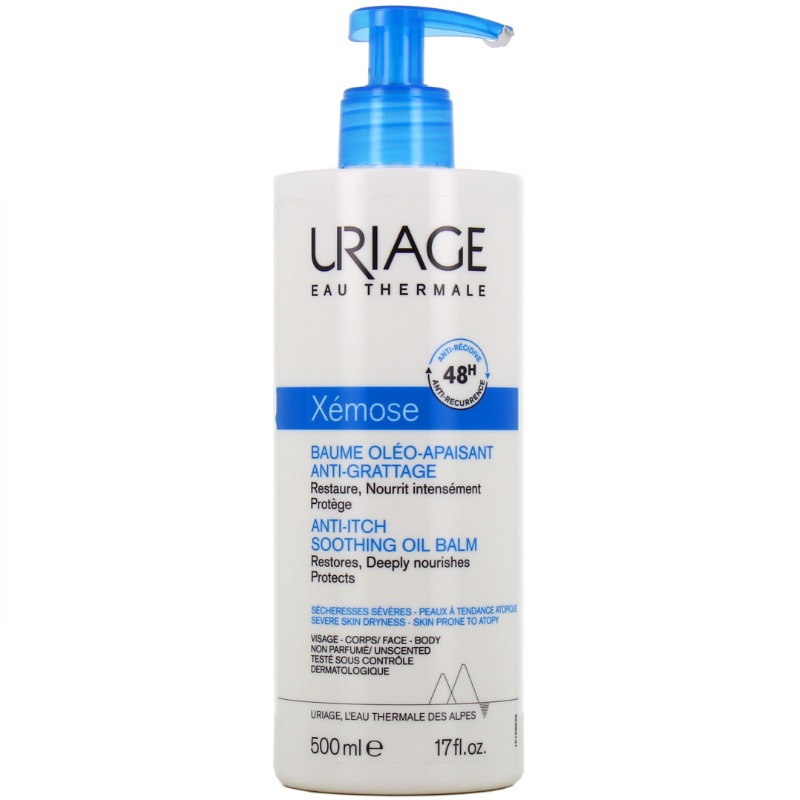 Le baume Oleo-Apaisant anti-grattage de la gamme Xemose d'Uriage apaise immédiatement et redonne un confort durable aux peaux sèches ou atopiques avec une texture baume en huile.